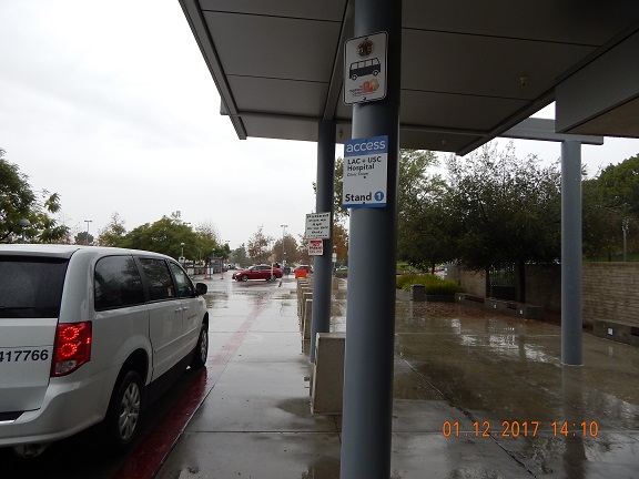 Stand 1 is located within the Clinic Tower Patient Pickup and Drop-off lot. The stand sign is posted approximately 116 feet outside of the Clinic Tower main entrance at the bus shelter and this is where riders can be picked up and dropped off. This location is on the Southwest side of the County USC campus directly north of the intersection of State Street and Marengo Street. Vehicles access this lot from State Street. The lot entrance is approximately 214 feet north on State Street from the intersection with Marengo.