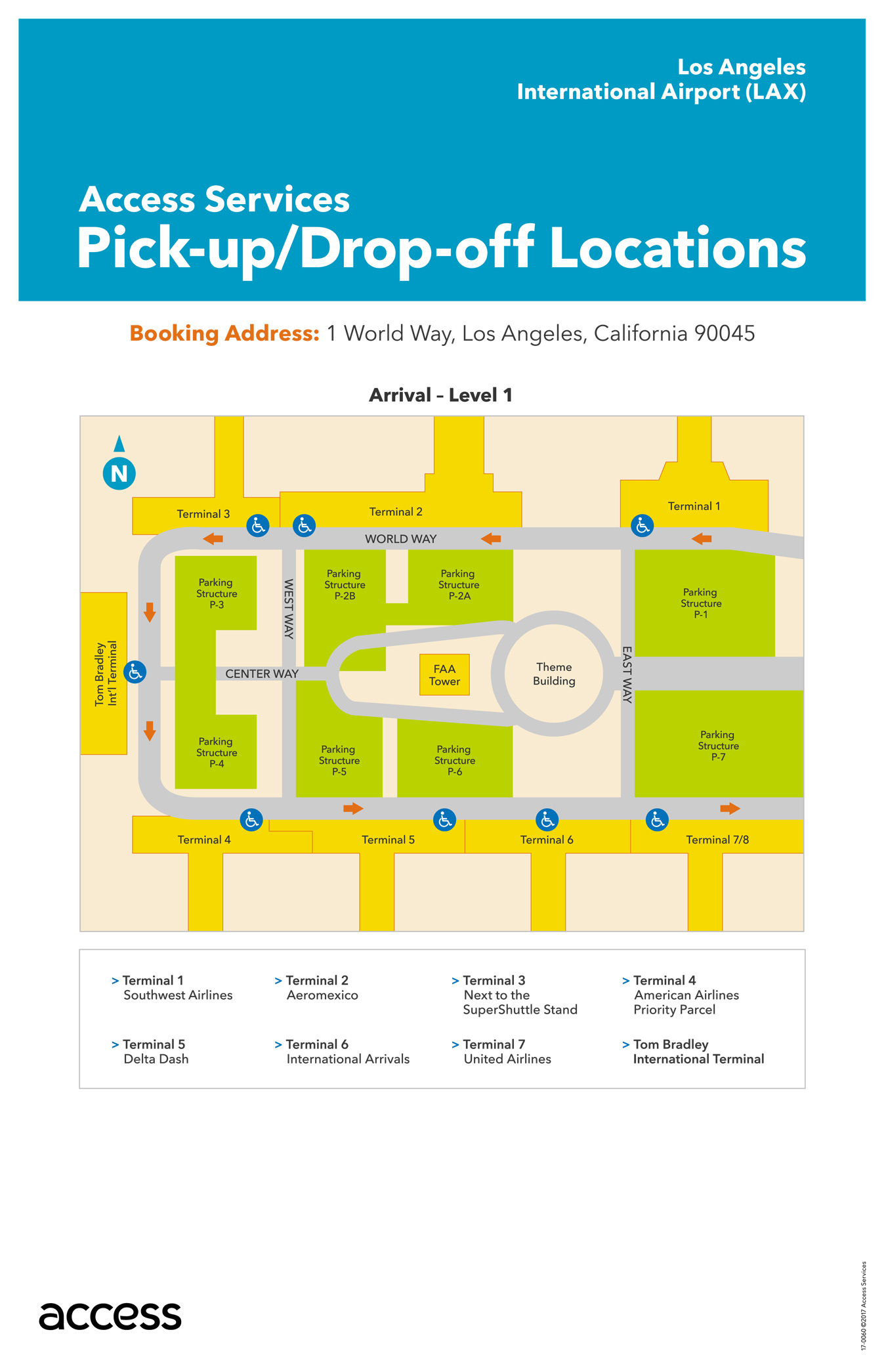 Access is happy to provide its service to riders traveling to and from Los Angeles International Airport (LAX) using the booking address 1 World Way, Los Angeles, California 90045.